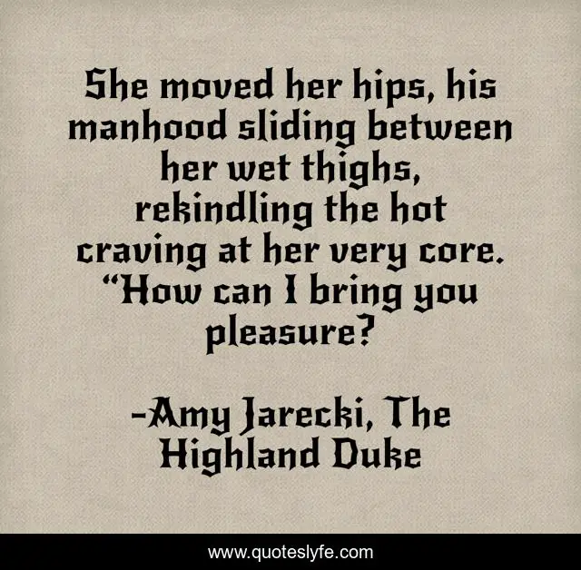 This page presents the quote "She moved her hips, his manhood sliding between her wet thighs, rekindling the hot craving at her very core. “How can I bring you pleasure?". Author of this quote is Amy Jarecki, The Highland Duke. This quote is about historical-romance, scottish-romance,.