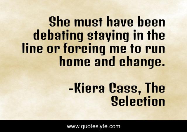 This page presents the quote "She must have been debating staying in the line or forcing me to run home and change.". Author of this quote is Kiera Cass, The Selection. .