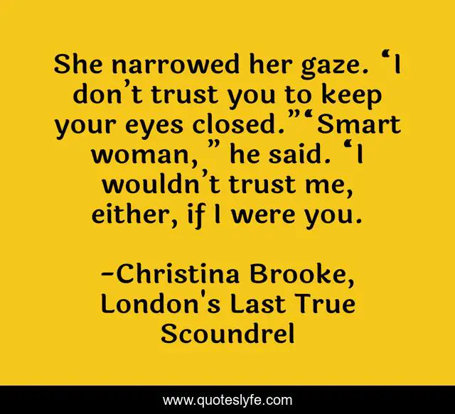 This page presents the quote "She narrowed her gaze. “I don’t trust you to keep your eyes closed.”“Smart woman, ” he said. “I wouldn’t trust me, either, if I were you.". Author of this quote is Christina Brooke, London's Last True Scoundrel. This quote is about regency-romance, romance, historical-romance,.