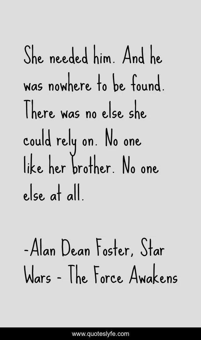 This page presents the quote "She needed him. And he was nowhere to be found. There was no else she could rely on. No one like her brother. No one else at all.". Author of this quote is Alan Dean Foster, Star Wars - The Force Awakens. .