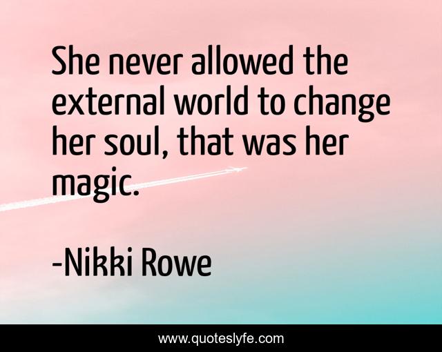 This page presents the quote "She never allowed the external world to change her soul, that was her magic.". Author of this quote is Nikki Rowe. This quote is about inspiration-through-illness, brave-heart, brave, love, inspire, mindful, light-worker, awareness, self-love,.