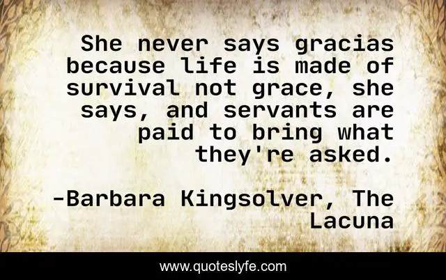 This page presents the quote "She never says gracias because life is made of survival not grace, she says, and servants are paid to bring what they're asked.". Author of this quote is Barbara Kingsolver, The Lacuna. This quote is about gracias, employees, grace, thanks, servants, survival,.