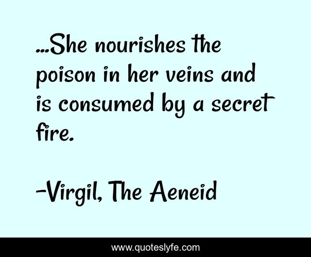This page presents the quote "...She nourishes the poison in her veins and is consumed by a secret fire.". Author of this quote is Virgil, The Aeneid. This quote is about greek, greek-mythology, mythology, aeneid,.