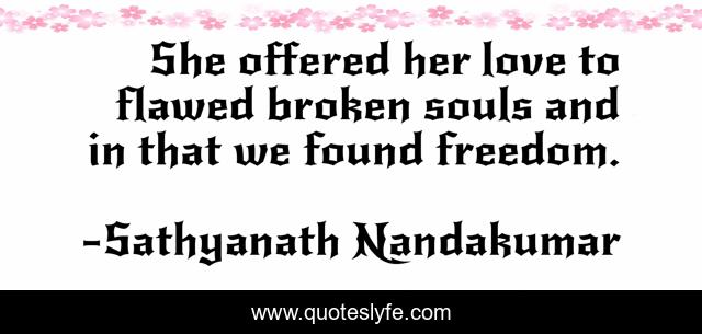 This page presents the quote "She offered her love to flawed broken souls and in that we found freedom.". Author of this quote is Sathyanath Nandakumar. This quote is about dark, love, affection,.