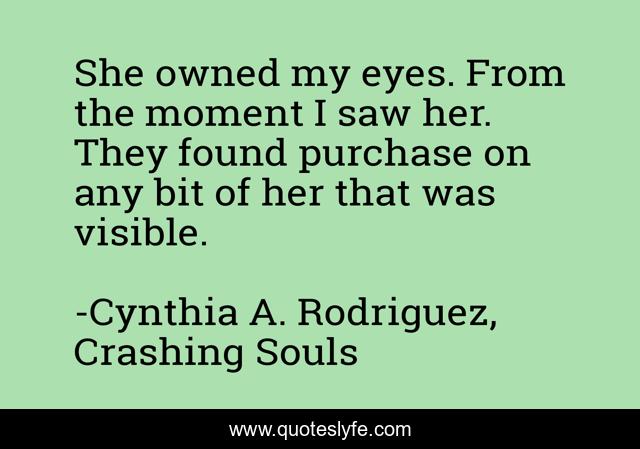 This page presents the quote "She owned my eyes. From the moment I saw her. They found purchase on any bit of her that was visible.". Author of this quote is Cynthia A. Rodriguez, Crashing Souls. This quote is about love, soulmates, affection,.