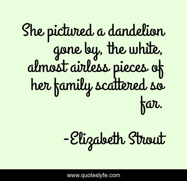This page presents the quote "She pictured a dandelion gone by, the white, almost airless pieces of her family scattered so far.". Author of this quote is Elizabeth Strout. .