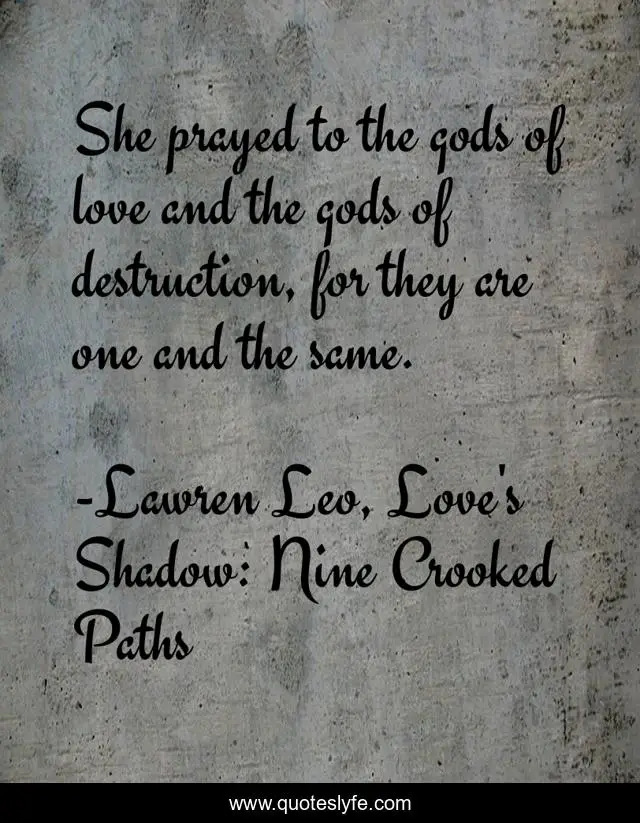 This page presents the quote "She prayed to the gods of love and the gods of destruction, for they are one and the same.". Author of this quote is Lawren Leo, Love's Shadow: Nine Crooked Paths. This quote is about death, love, god, gods, prayer, affection, destruction,.