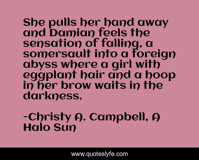 This page presents the quote "She pulls her hand away and Damian feels the sensation of falling, a somersault into a foreign abyss where a girl with eggplant hair and a hoop in her brow waits in the darkness.". Author of this quote is Christy A. Campbell, A Halo Sun. This quote is about heartache, mystery, death, love, relationships, young-adult-fantasy, girls, young-adult-romance, souls,.