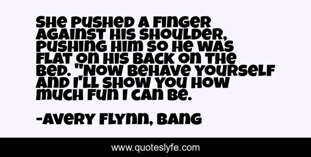 This page presents the quote "She pushed a finger against his shoulder, pushing him so he was flat on his back on the bed. "Now behave yourself and I'll show you how much fun I can be.". Author of this quote is Avery Flynn, Bang. .