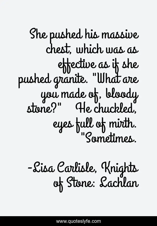 This page presents the quote "She pushed his massive chest, which was as effective as if she pushed granite. "What are you made of, bloody stone?" He chuckled, eyes full of mirth. "Sometimes.". Author of this quote is Lisa Carlisle, Knights of Stone: Lachlan. This quote is about wolf-shifters, paranormal-urban-fantasy-romance, gargoyles, witches,.