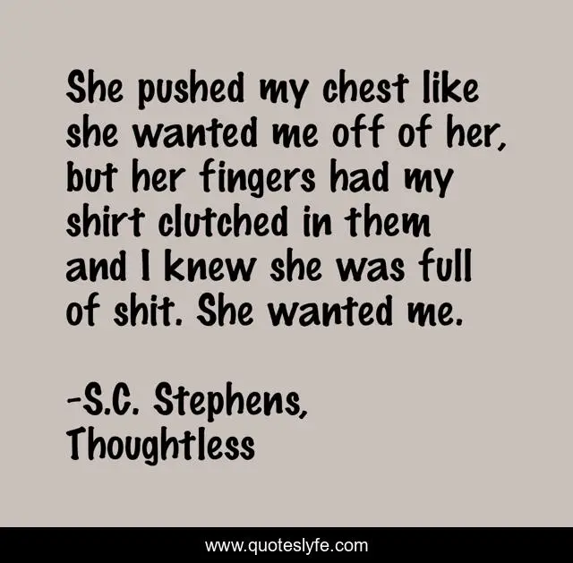 This page presents the quote "She pushed my chest like she wanted me off of her, but her fingers had my shirt clutched in them and I knew she was full of shit. She wanted me.". Author of this quote is S.C. Stephens, Thoughtless. This quote is about lust, passion, adult-romance,.