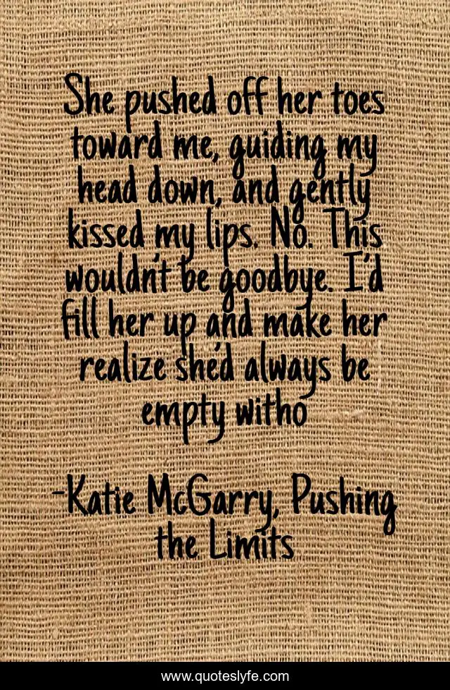 This page presents the quote "She pushed off her toes toward me, guiding my head down, and gently kissed my lips. No. This wouldn’t be goodbye. I’d fill her up and make her realize she’d always be empty witho". Author of this quote is Katie McGarry, Pushing the Limits. This quote is about goodbye, no, echo-emerson, break-up, noah-hutchins, kiss, sorry,.