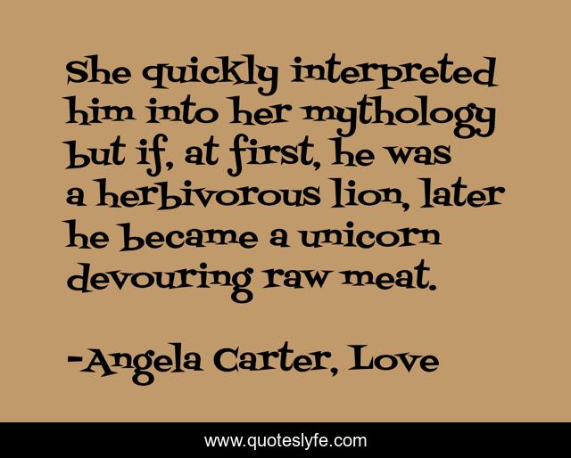This page presents the quote "She quickly interpreted him into her mythology but if, at first, he was a herbivorous lion, later he became a unicorn devouring raw meat.". Author of this quote is Angela Carter, Love. .