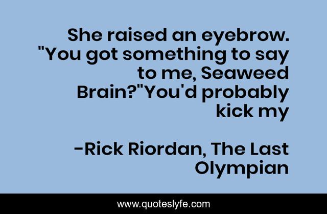 This page presents the quote "She raised an eyebrow. "You got something to say to me, Seaweed Brain?"You'd probably kick my". Author of this quote is Rick Riordan, The Last Olympian. This quote is about percy-jackson, annabeth-chase,.