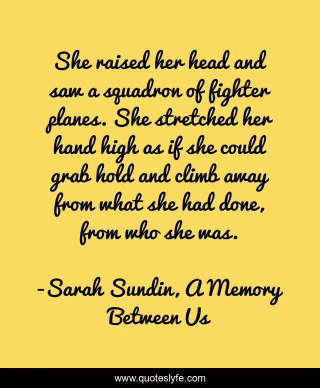 This page presents the quote "She raised her head and saw a squadron of fighter planes. She stretched her hand high as if she could grab hold and climb away from what she had done, from who she was.". Author of this quote is Sarah Sundin, A Memory Between Us. This quote is about romance, historical-fiction, world-war-2,.