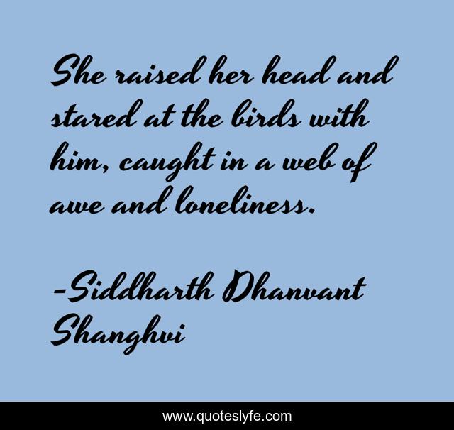 This page presents the quote "She raised her head and stared at the birds with him, caught in a web of awe and loneliness.". Author of this quote is Siddharth Dhanvant Shanghvi. .