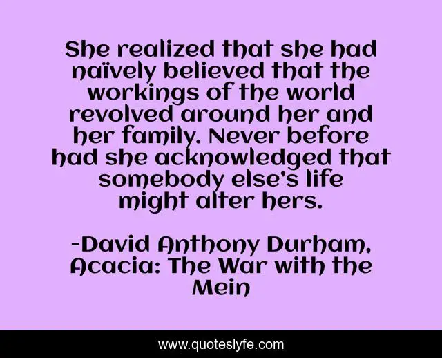 This page presents the quote "She realized that she had naïvely believed that the workings of the world revolved around her and her family. Never before had she acknowledged that somebody else’s life might alter hers.". Author of this quote is David Anthony Durham, Acacia: The War with the Mein. This quote is about naivety, reality-of-life, loss-of-innocence, epiphanic-moment, realization,.