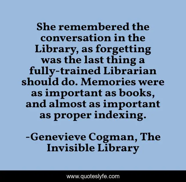 This page presents the quote "She remembered the conversation in the Library, as forgetting was the last thing a fully-trained Librarian should do. Memories were as important as books, and almost as important as proper indexing.". Author of this quote is Genevieve Cogman, The Invisible Library. This quote is about librarian, humor, library,.