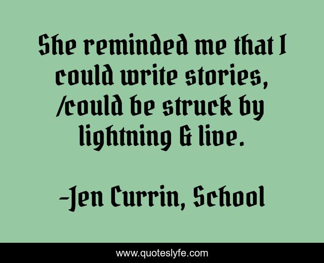 This page presents the quote "She reminded me that I could write stories, /could be struck by lightning & live.". Author of this quote is Jen Currin, School. This quote is about poem, stories, poetry, writing,.