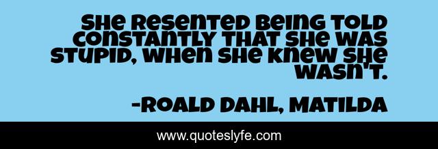 This page presents the quote "She resented being told constantly that she was stupid, when she knew she wasn't.". Author of this quote is Roald Dahl, Matilda. This quote is about resent, identity, selfworth,.