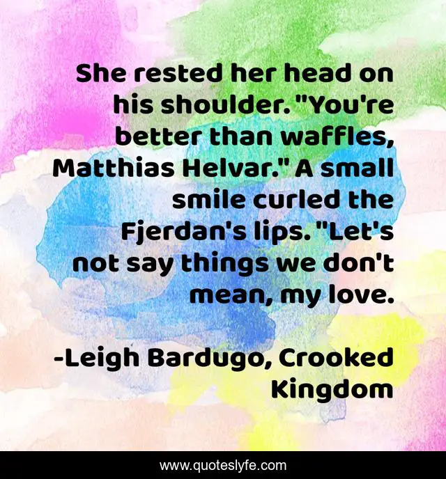 This page presents the quote "She rested her head on his shoulder. "You're better than waffles, Matthias Helvar." A small smile curled the Fjerdan's lips. "Let's not say things we don't mean, my love.". Author of this quote is Leigh Bardugo, Crooked Kingdom. This quote is about food, love, affection,.