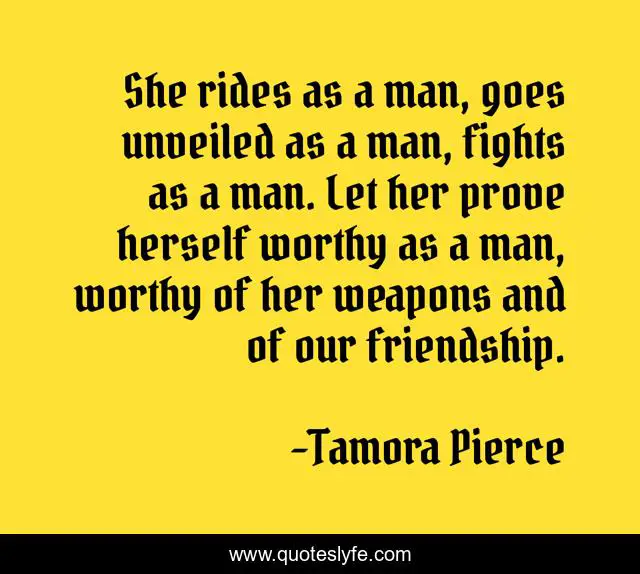 This page presents the quote "She rides as a man, goes unveiled as a man, fights as a man. Let her prove herself worthy as a man, worthy of her weapons and of our friendship.". Author of this quote is Tamora Pierce. .