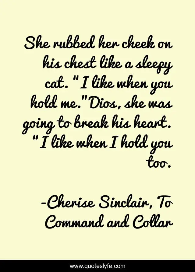 This page presents the quote "She rubbed her cheek on his chest like a sleepy cat. “I like when you hold me.”Dios, she was going to break his heart. “I like when I hold you too.". Author of this quote is Cherise Sinclair, To Command and Collar. This quote is about romance, erotic-romance, romantic,.