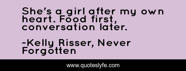 This page presents the quote "She's a girl after my own heart. Food first, conversation later.". Author of this quote is Kelly Risser, Never Forgotten. This quote is about heart, humor, family, food, conversation, female, love, girl, young-adult,.