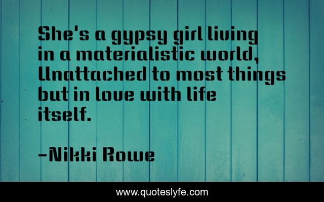 This page presents the quote "She's a gypsy girl living in a materialistic world, Unattached to most things but in love with life itself.". Author of this quote is Nikki Rowe. This quote is about gypsy-girl, life, freedom, wild-and-free, gypsy, gypsy-soul, free-spirit, unique, authentic,.