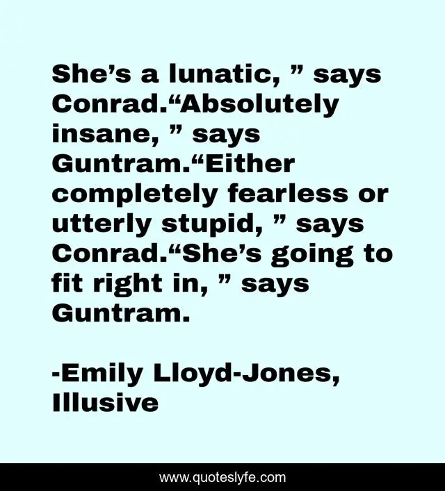This page presents the quote "She’s a lunatic, ” says Conrad.“Absolutely insane, ” says Guntram.“Either completely fearless or utterly stupid, ” says Conrad.“She’s going to fit right in, ” says Guntram.". Author of this quote is Emily Lloyd-Jones, Illusive. This quote is about ya-lit, funny, criminals, comedy, sci-fi,.