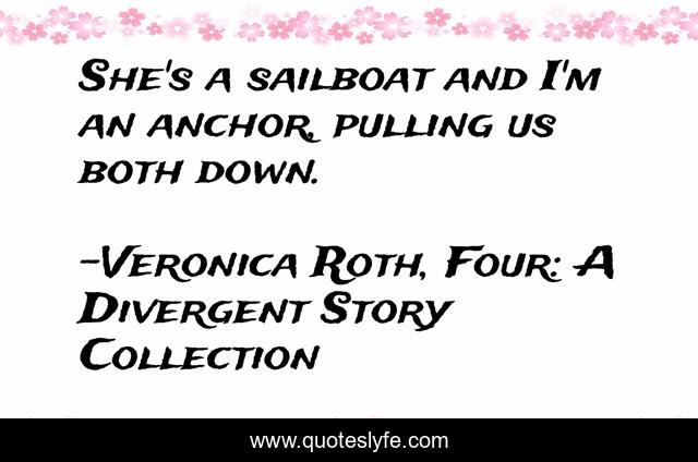 This page presents the quote "She's a sailboat and I'm an anchor, pulling us both down.". Author of this quote is Veronica Roth, Four: A Divergent Story Collection. This quote is about life, love, inspirational, quote, experience, wisdom, romance, book, books,.