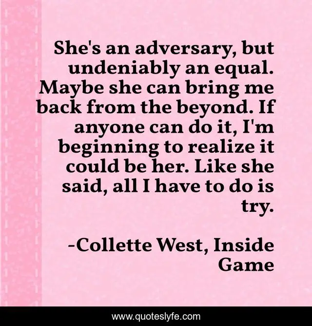 This page presents the quote "She's an adversary, but undeniably an equal. Maybe she can bring me back from the beyond. If anyone can do it, I'm beginning to realize it could be her. Like she said, all I have to do is try.". Author of this quote is Collette West, Inside Game. This quote is about new-york-kings, baseball-romance, contemporary-romance, sports-romance, collette-west, drake-schultz,.