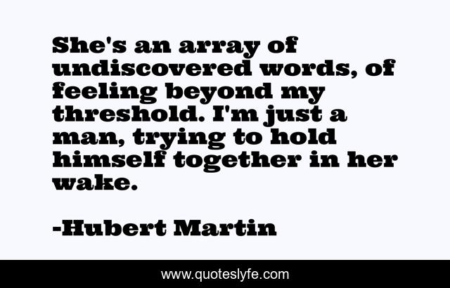 This page presents the quote "She's an array of undiscovered words, of feeling beyond my threshold. I'm just a man, trying to hold himself together in her wake.". Author of this quote is Hubert Martin. This quote is about love, honesty, intelligence, deep, sleep, best, poem, confidence, humor,.