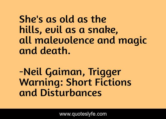 This page presents the quote "She's as old as the hills, evil as a snake, all malevolence and magic and death.". Author of this quote is Neil Gaiman, Trigger Warning: Short Fictions and Disturbances. This quote is about sorceress-and-magic, queen, evil, short-stories, fairy-tales, witch,.