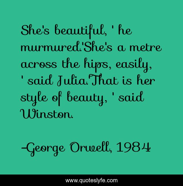 This page presents the quote "She's beautiful, ' he murmured.'She's a metre across the hips, easily, ' said Julia.'That is her style of beauty, ' said Winston.". Author of this quote is George Orwell, 1984. This quote is about beautiful, style, beauty, fat, inspirational, enthusiasm,.