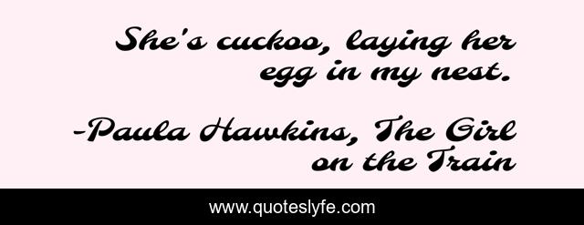 This page presents the quote "She's cuckoo, laying her egg in my nest.". Author of this quote is Paula Hawkins, The Girl on the Train. This quote is about infidelity, betrayal,.