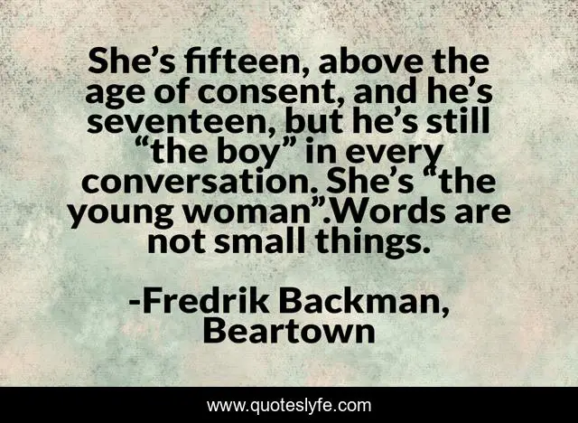 This page presents the quote "She’s fifteen, above the age of consent, and he’s seventeen, but he’s still “the boy” in every conversation. She’s “the young woman”.Words are not small things.". Author of this quote is Fredrik Backman, Beartown. .