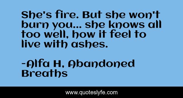 This page presents the quote "She's fire. But she won't burn you... she knows all too well, how it feel to live with ashes.". Author of this quote is Alfa H, Abandoned Breaths. This quote is about relationships, life, love, poetry, affection,.