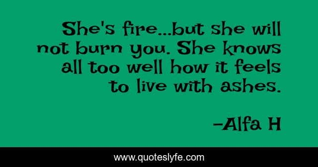 This page presents the quote "She's fire...but she will not burn you. She knows all too well how it feels to live with ashes.". Author of this quote is Alfa H. This quote is about heartache, love, ashes, fire, hurt, quotes, burned, affection,.