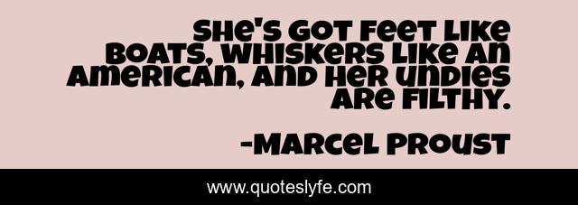 This page presents the quote "She's got feet like boats, whiskers like an American, and her undies are filthy.". Author of this quote is Marcel Proust. This quote is about literature, within-a-budding-grove,.