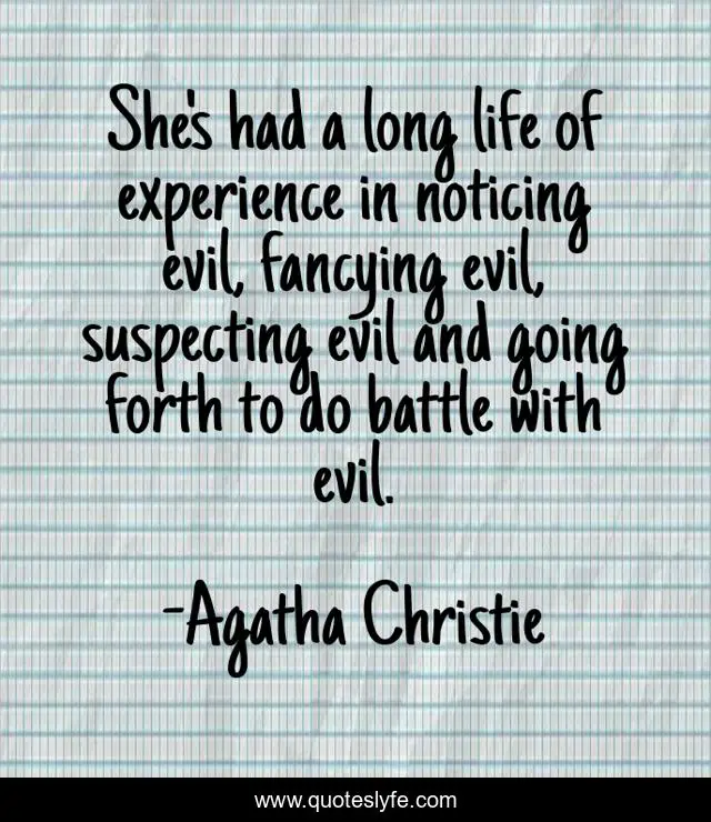This page presents the quote "She's had a long life of experience in noticing evil, fancying evil, suspecting evil and going forth to do battle with evil.". Author of this quote is Agatha Christie. This quote is about murder, evil, miss-marple,.