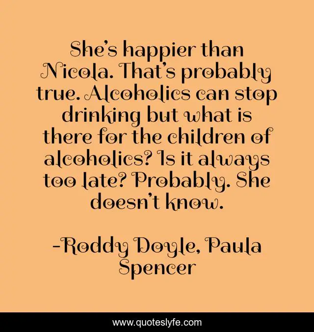 This page presents the quote "She’s happier than Nicola. That’s probably true. Alcoholics can stop drinking but what is there for the children of alcoholics? Is it always too late? Probably. She doesn’t know.". Author of this quote is Roddy Doyle, Paula Spencer. This quote is about children-of-alcoholics, alcoholism, children,.