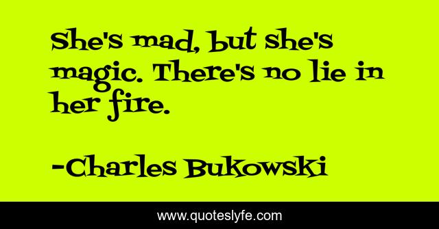 This page presents the quote "She's mad, but she's magic. There's no lie in her fire.". Author of this quote is Charles Bukowski. This quote is about fire, love, magic, affection, women,.