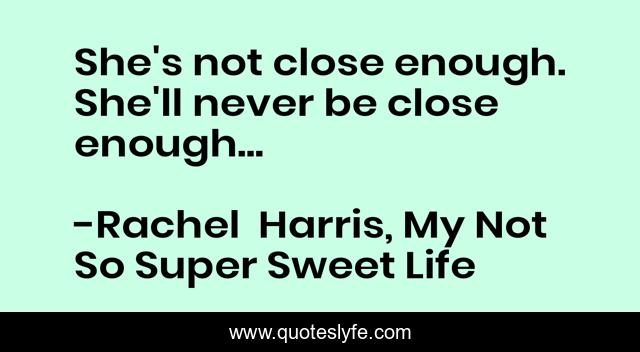 This page presents the quote "She's not close enough. She'll never be close enough...". Author of this quote is Rachel Harris, My Not So Super Sweet Life. This quote is about romance, ya, young-adult, young-adult-romance,.