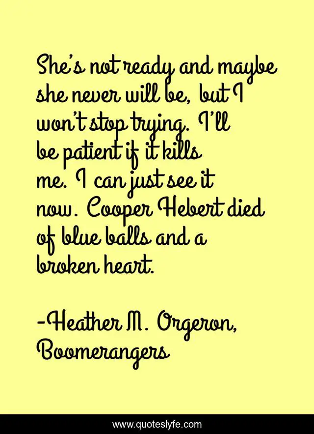 This page presents the quote "She’s not ready and maybe she never will be, but I won’t stop trying. I’ll be patient if it kills me. I can just see it now. Cooper Hebert died of blue balls and a broken heart.". Author of this quote is Heather M. Orgeron, Boomerangers. This quote is about funny, love, romance, romantic-comedy, comedy, affection,.