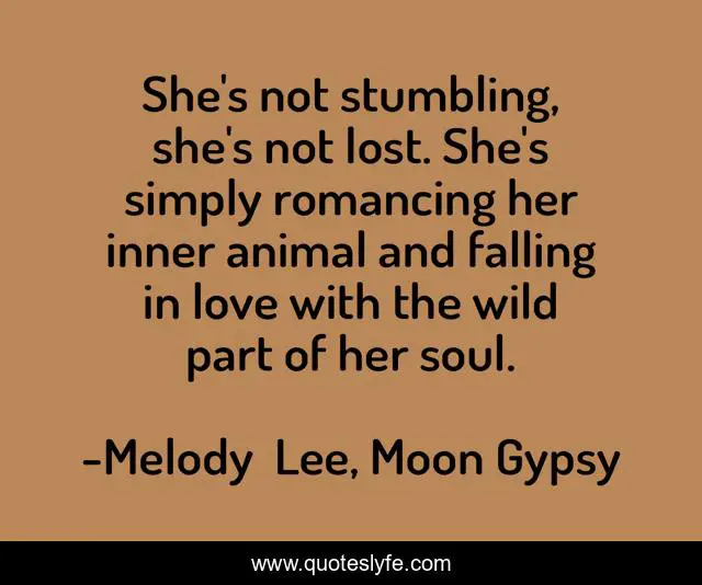 This page presents the quote "She's not stumbling, she's not lost. She's simply romancing her inner animal and falling in love with the wild part of her soul.". Author of this quote is Melody Lee, Moon Gypsy. This quote is about self-love, love, poetry, soul, wild, books-reading, affection, inspiration,.