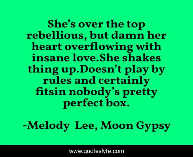 This page presents the quote "She’s over the top rebellious, but damn her heart overflowing with insane love.She shakes thing up.Doesn’t play by rules and certainly fitsin nobody’s pretty perfect box.". Author of this quote is Melody Lee, Moon Gypsy. This quote is about relationships, love, poetry, affection, soul,.