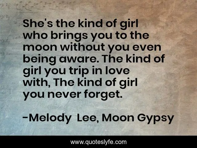 This page presents the quote "She's the kind of girl who brings you to the moon without you even being aware. The kind of girl you trip in love with, The kind of girl you never forget.". Author of this quote is Melody Lee, Moon Gypsy. This quote is about love, moon-gypsy-book, poetry, moon, girl, in-love, affection,.