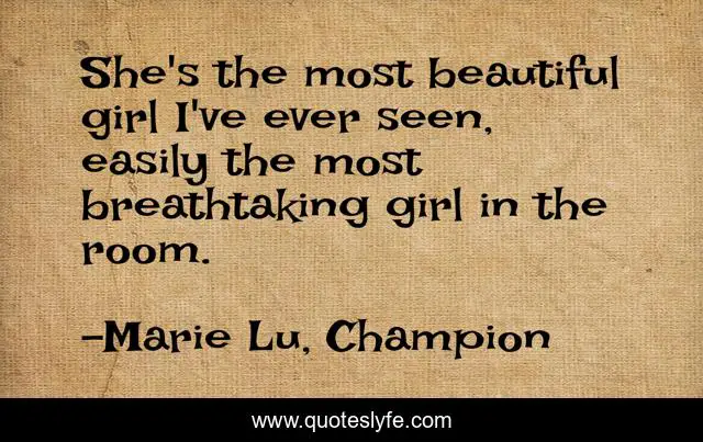 This page presents the quote "She's the most beautiful girl I've ever seen, easily the most breathtaking girl in the room.". Author of this quote is Marie Lu, Champion. This quote is about beautiful, breathtaking, june-iparis, day,.