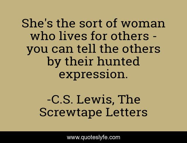 This page presents the quote "She's the sort of woman who lives for others - you can tell the others by their hunted expression.". Author of this quote is C.S. Lewis, The Screwtape Letters. This quote is about humor, zealousness, women,.